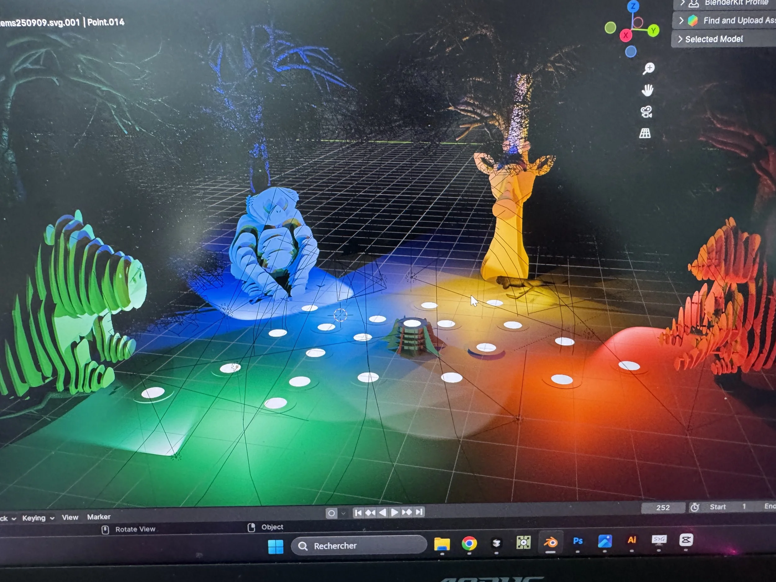 Une fois l’univers posé, nous avons produit l’ensemble des contenus artistiques : animations 3D, effets de lumière, constellations, transitions, panneaux, illustrations, musiques originales, ambiances sonores et enregistrement de la voix off. Nous avons également conçu la scénographie du parcours, pensé les implantations possibles, anticipé les contraintes lumineuses et travaillé chaque ambiance sonore scène par scène. Cette phase a mobilisé des compétences en motion design, montage, modélisation, écriture sonore et mixage.