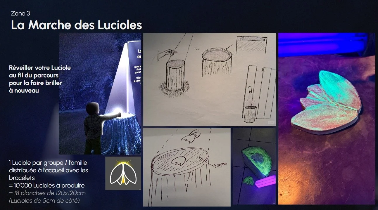 Nous avons commencé par construire l’intention artistique générale et la narration complète du parcours. Cela signifiait écrire une histoire cohérente, choisir les symboles, définir le rôle des Lucioles, préciser les missions des Gardiens et structurer le cheminement scène par scène.