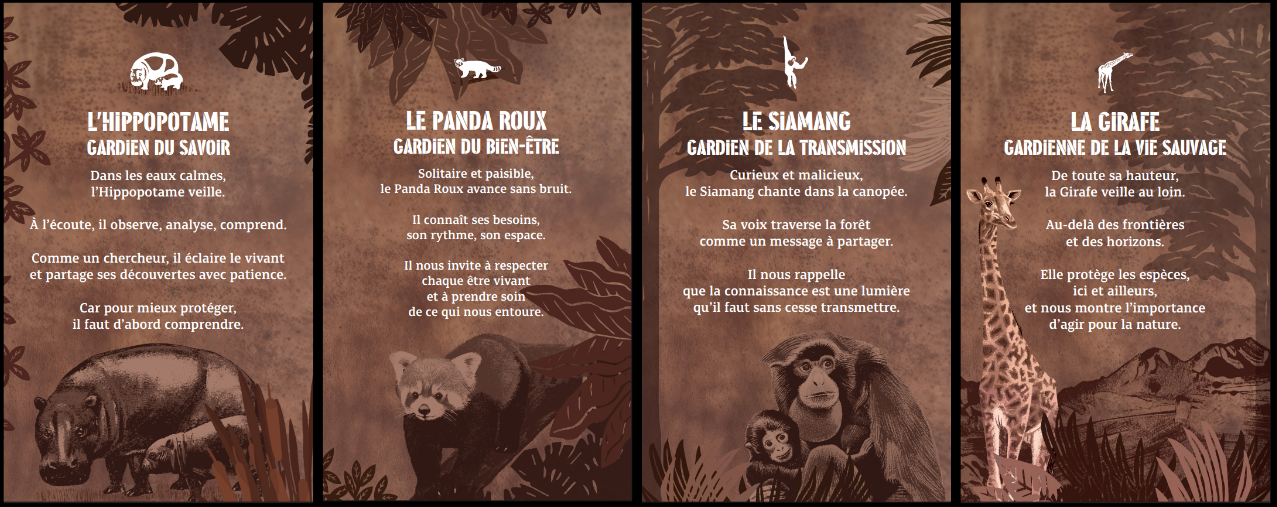 les Lucioles guident les visiteurs vers les quatre Gardiens de Branféré, porteurs des missions fondatrices du parc : Comprendre, Prendre soin, Transmettre et Protéger.