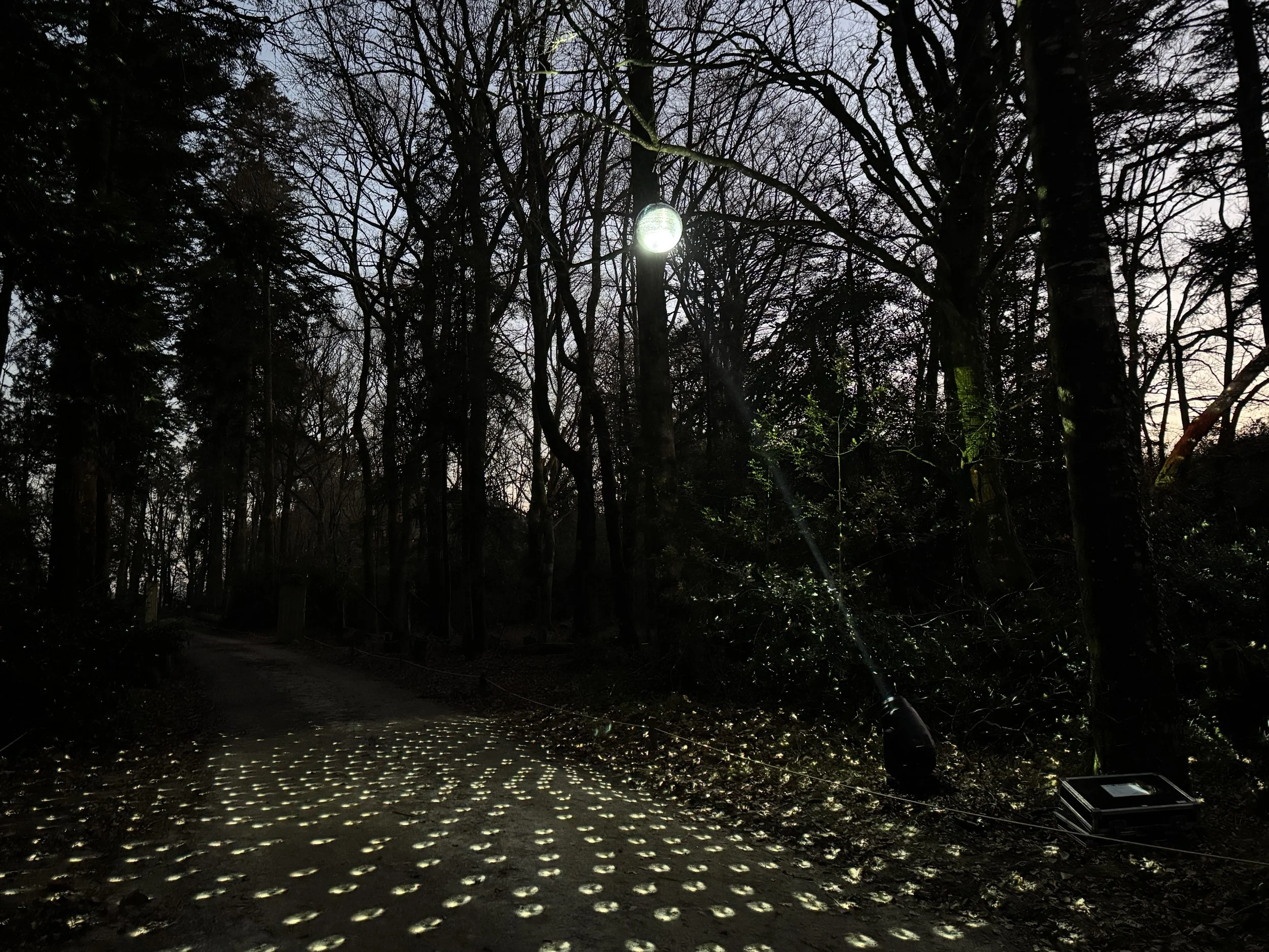 Pour la phase finale, nous avons travaillé avec 109 pour déployer l’expérience dans la forêt. Cela a impliqué la mise en lumière, le placement précis du matériel, les tests nocturnes, la calibration, la synchronisation son/lumière, les ajustements en temps réel et la consolidation de chaque scène.