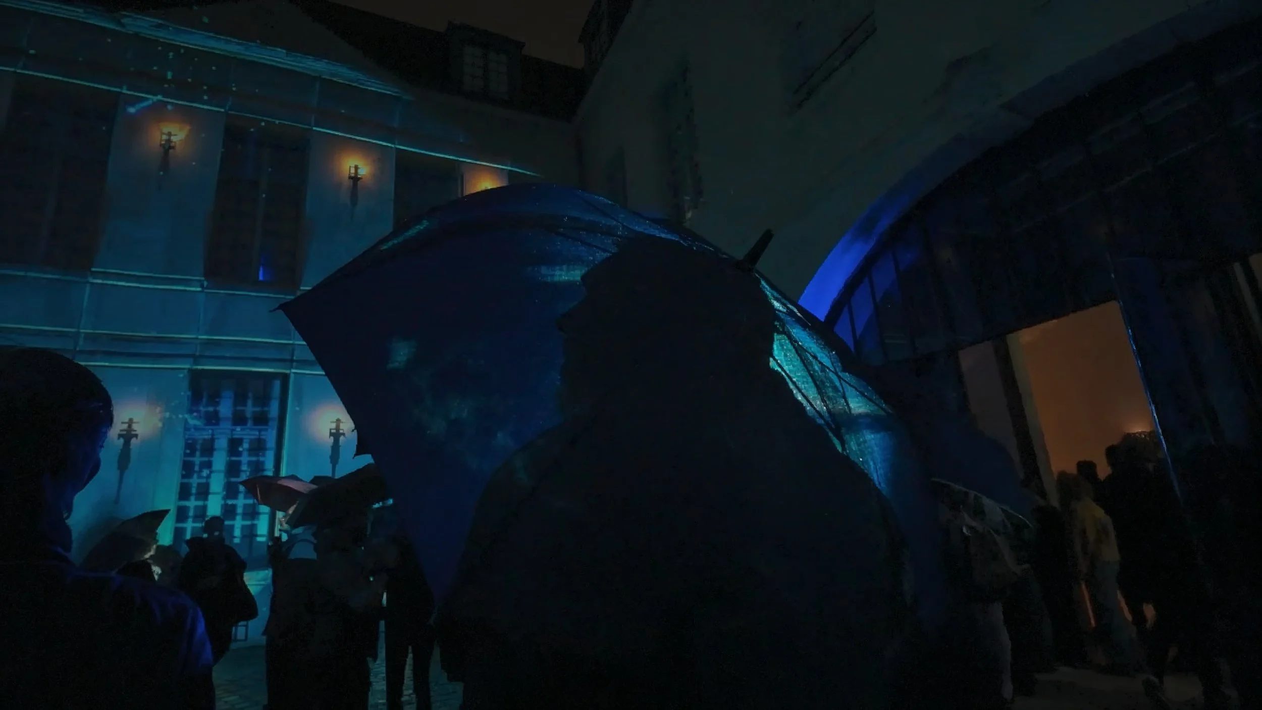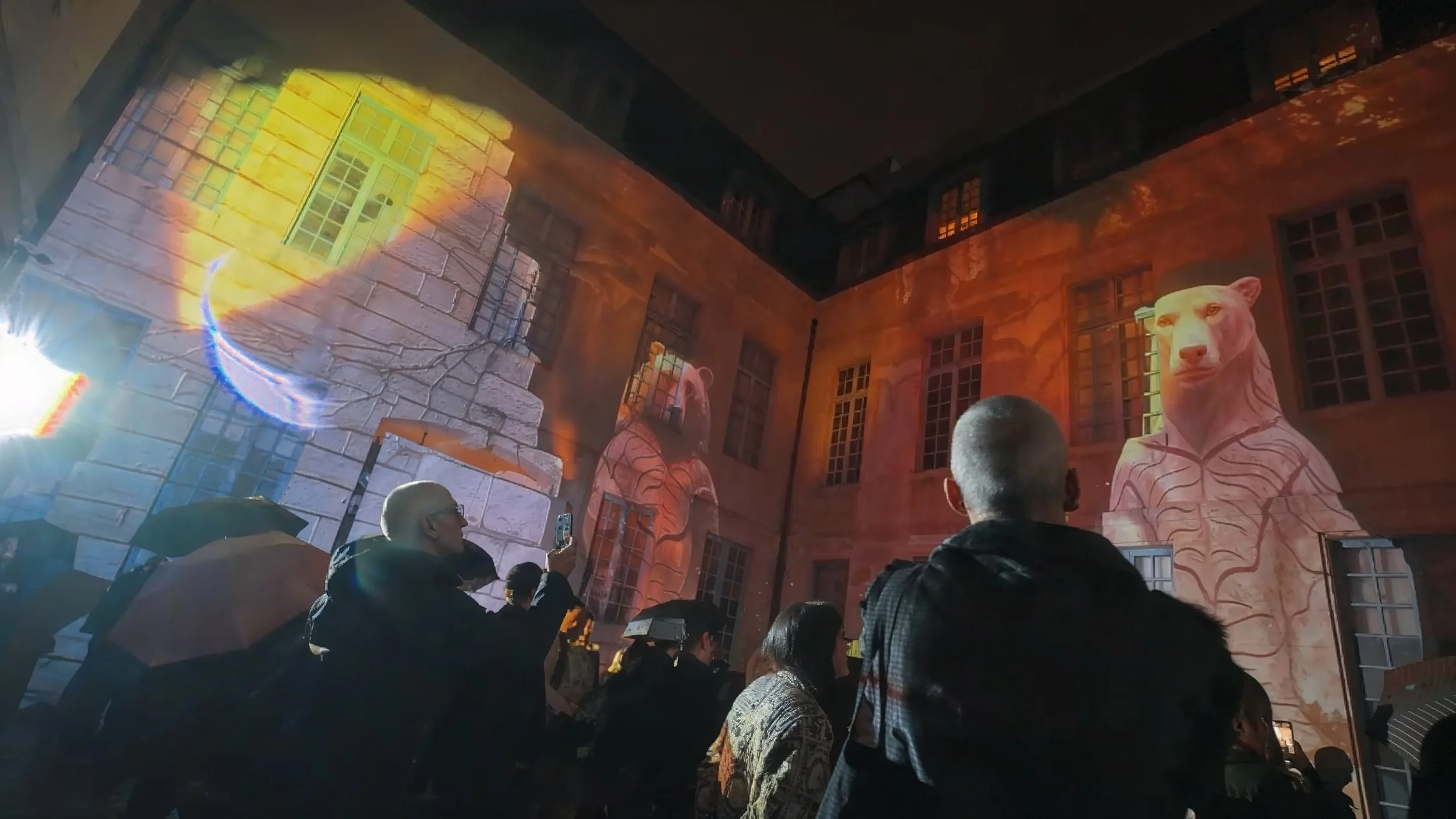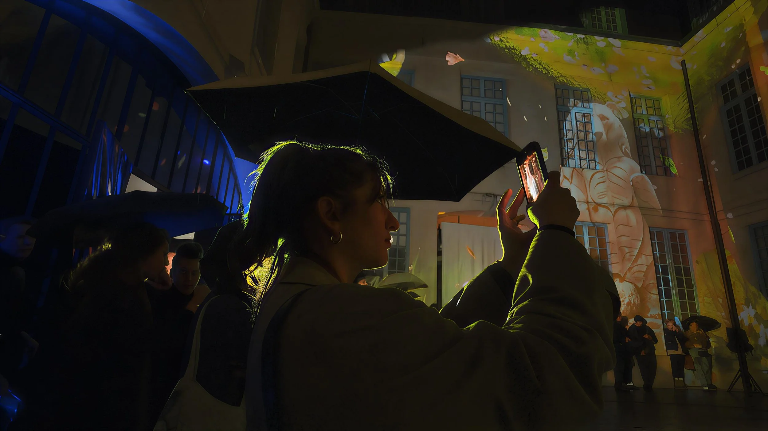 Sur place, nos équipes ont procédé à une calibration millimétrée des projections : alignement, warping, colorimétrie, fusion des faisceaux, adaptation en temps réel aux reliefs du bâtiment.