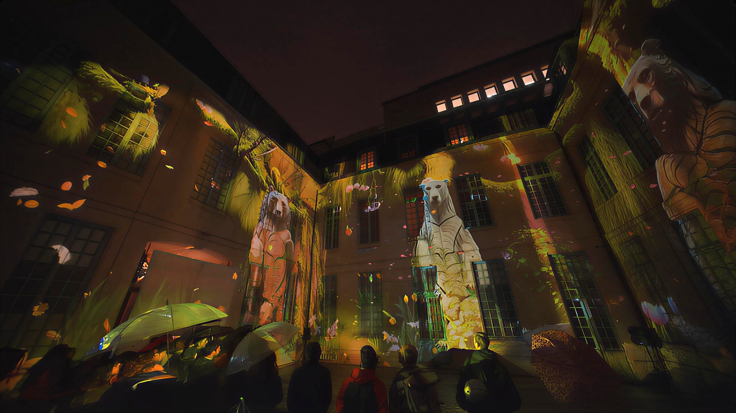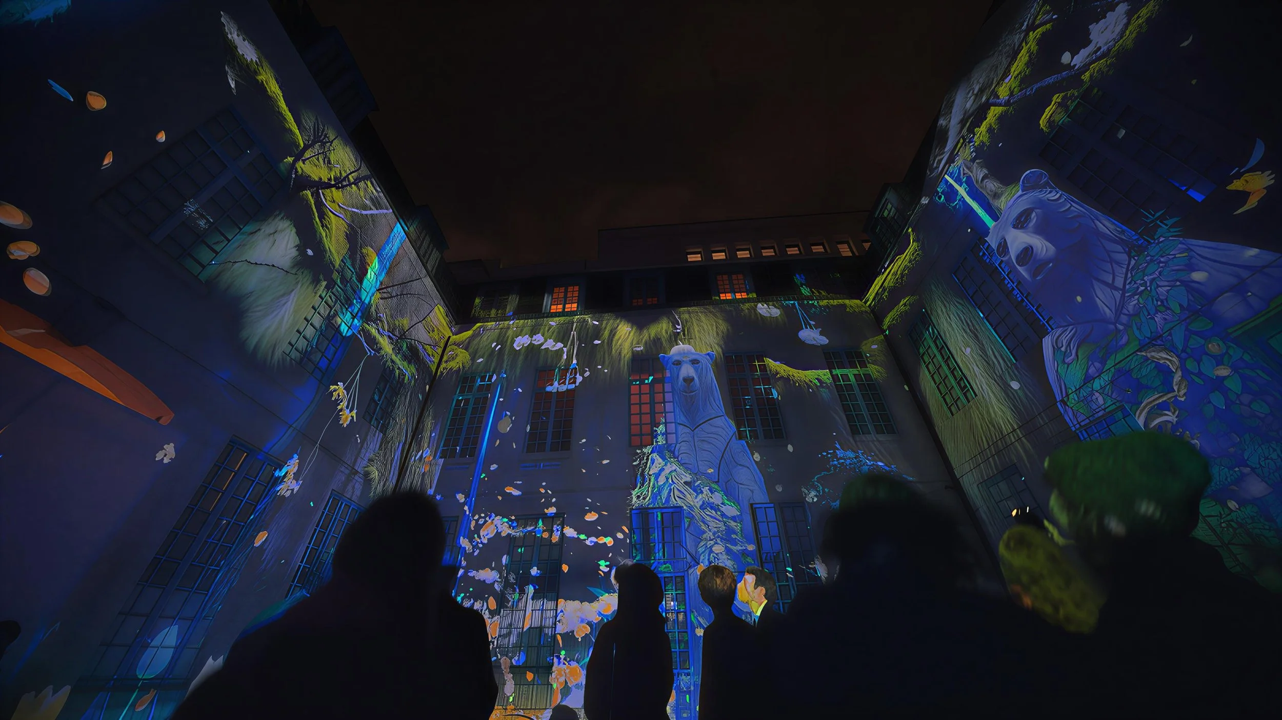 Au cœur du Musée de la Chasse et de la Nature dans le Marais, nous avons réinventé la traditionnelle Fête de l’Ours, transformant la cour intérieure en une fresque lumineuse monumentale.
