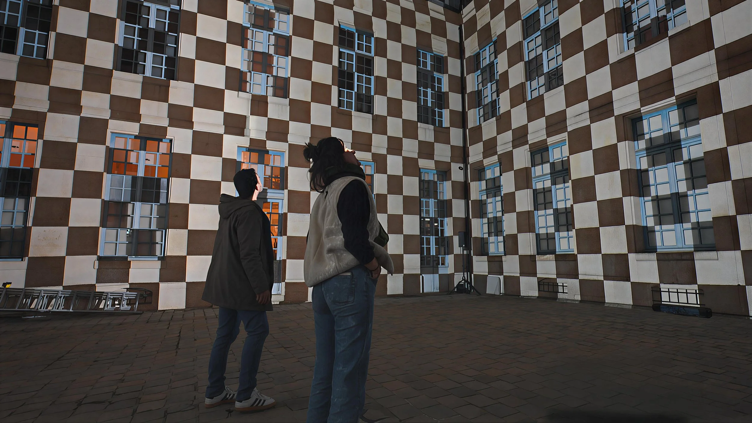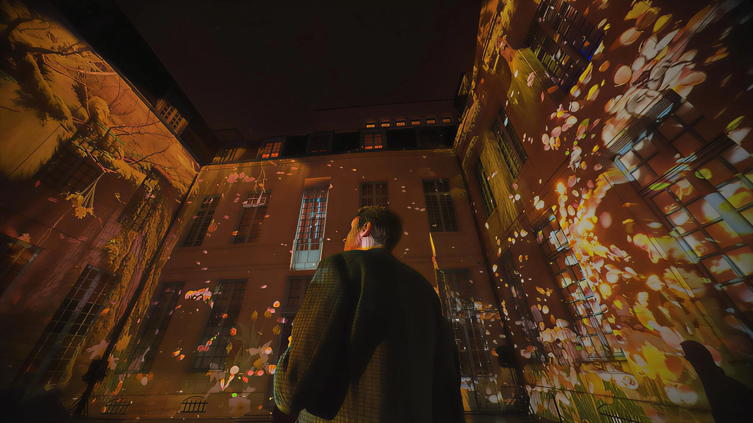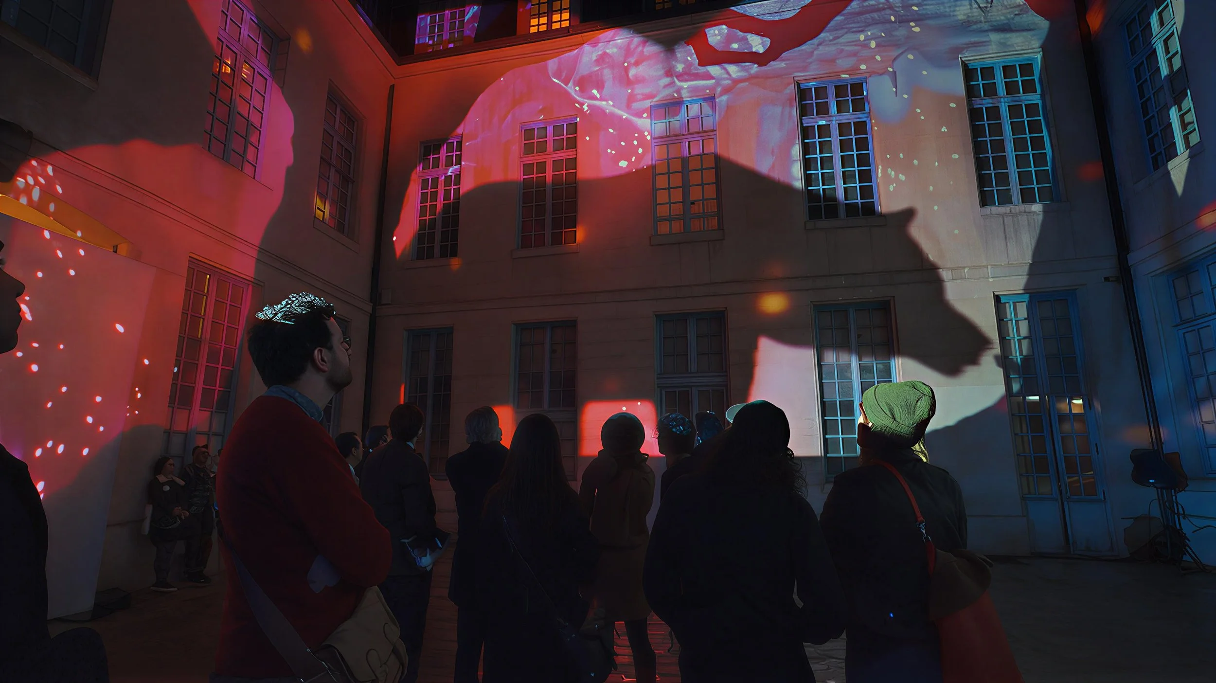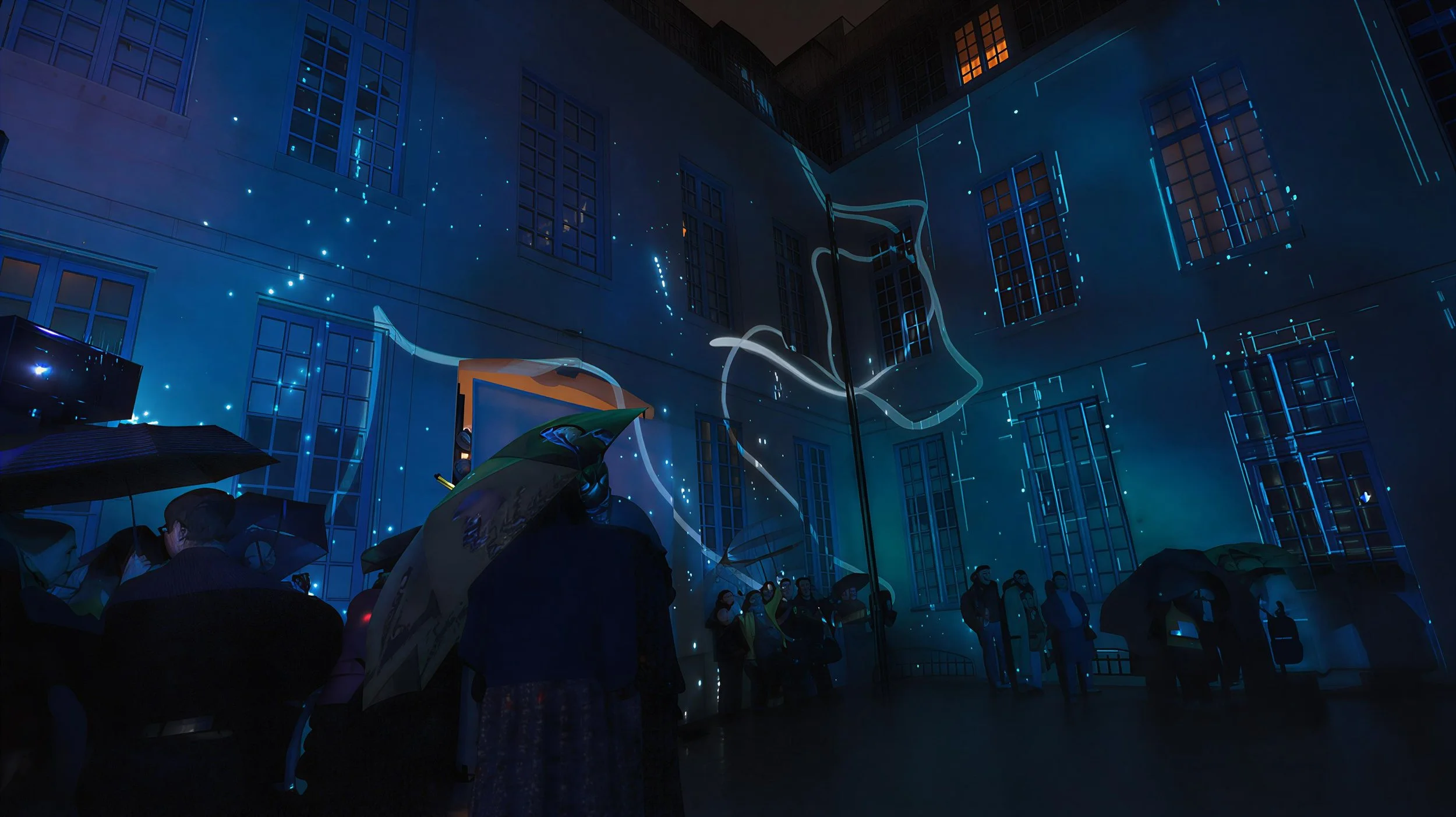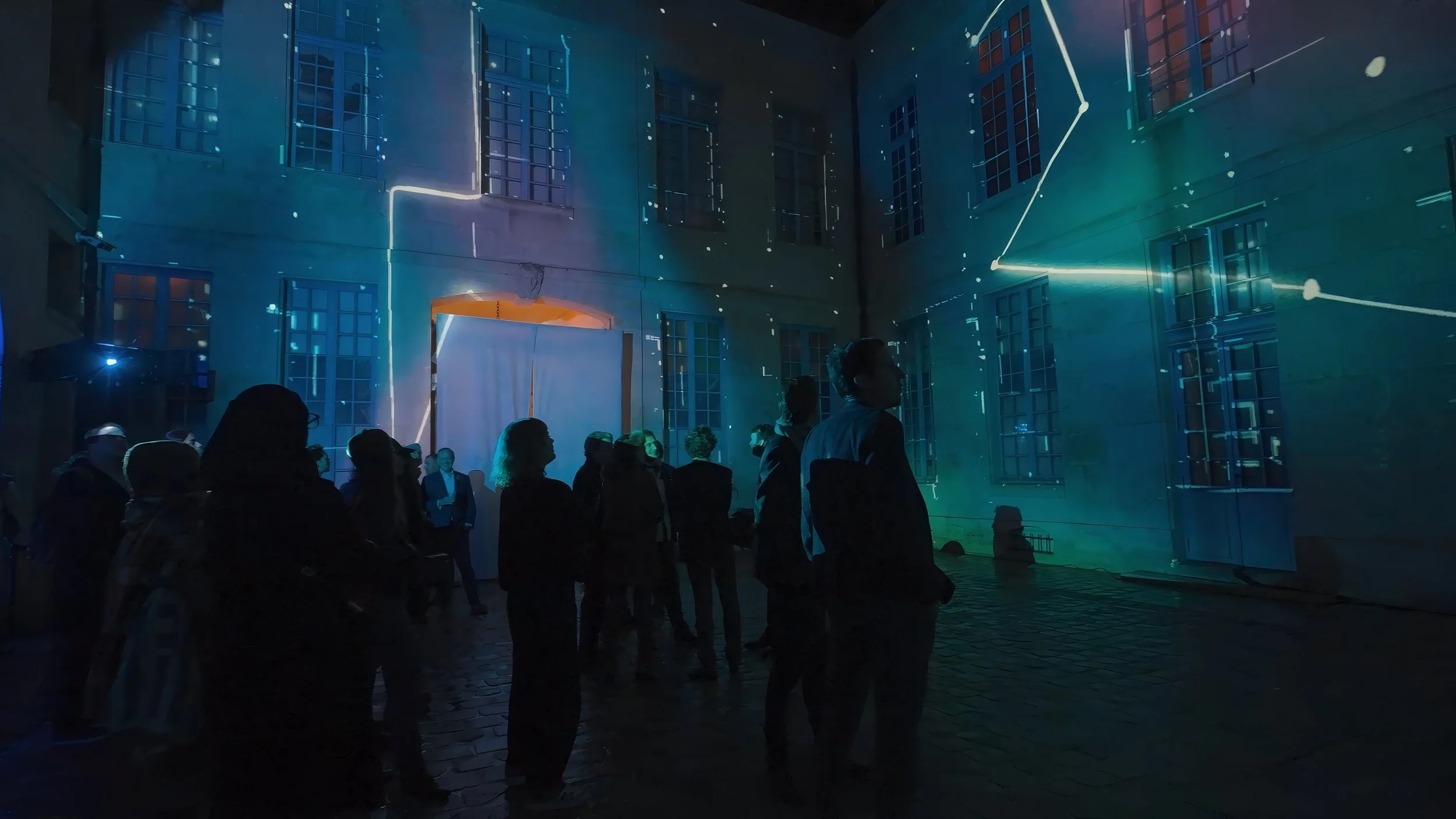 Pour transformer la cour intérieure du musée en scène immersive, nous avons déployé un dispositif multi-projection couvrant l’ensemble des façades. Cette étape a commencé par une étude de projection approfondie : analyse des volumes, relevé architectural précis, simulations d’angles et de distances pour garantir une couverture homogène malgré la complexité du lieu.